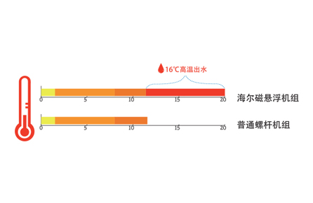 磁悬浮机组不使用任何润滑油,所以不需要回油压差,可以做高温出水16°C (到20°C) 机组,而普通螺杆机组由于需要建立回油压差,故难以实现高温出水机组。